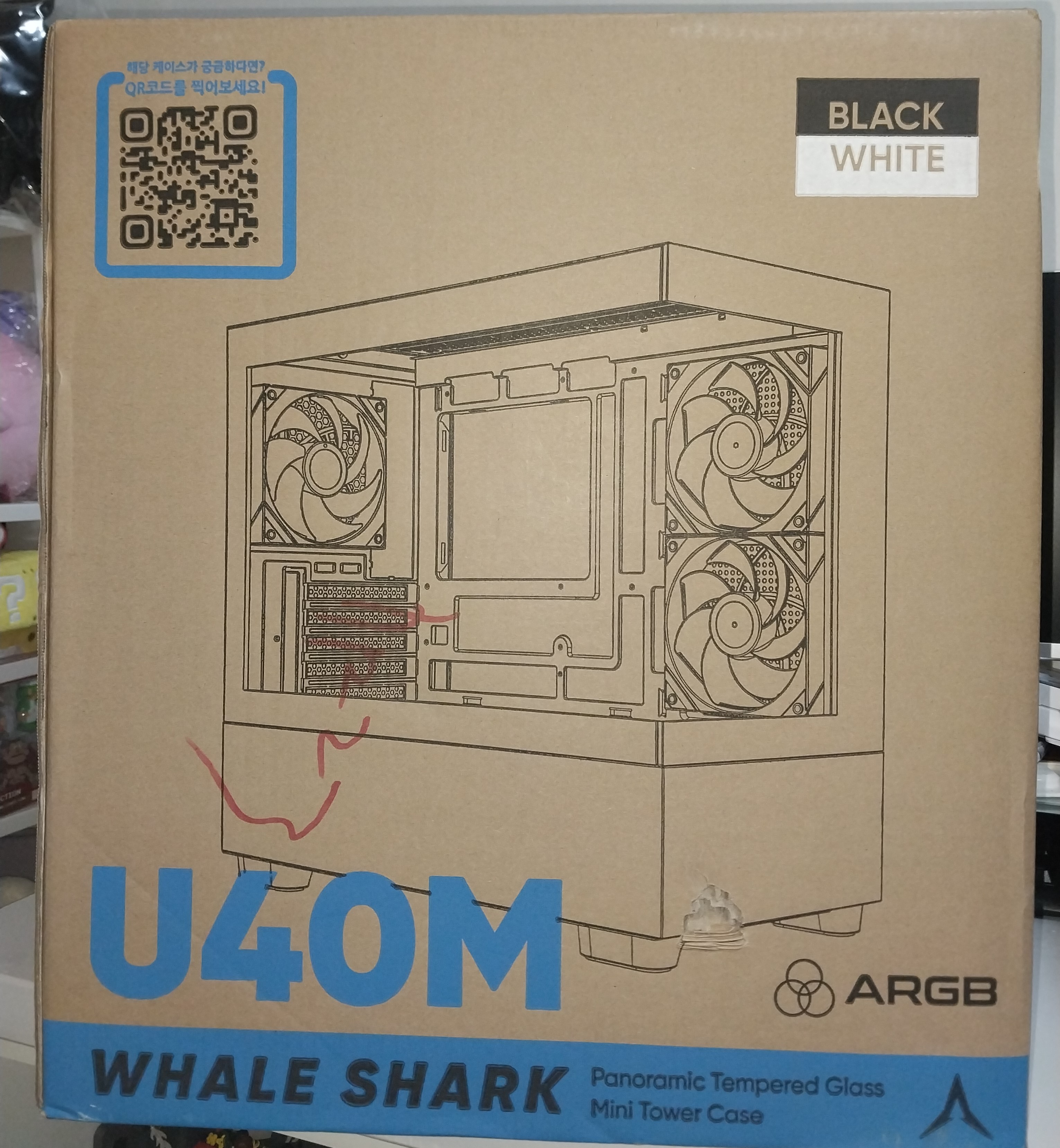 앱코 U40M 웨일샤크 ARGB BTF (블랙화이트) PC케이스의 제품 상자 사진입니다.
