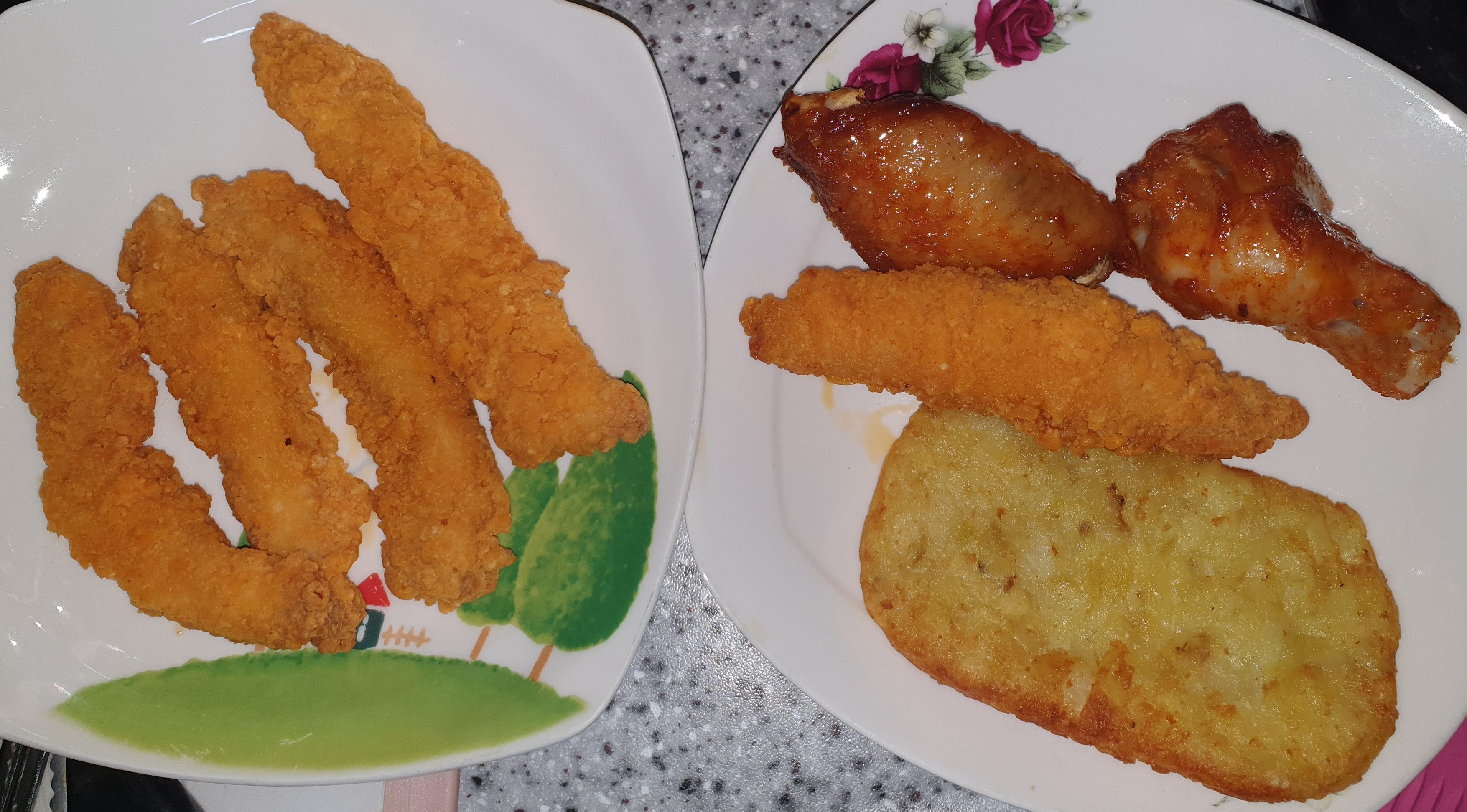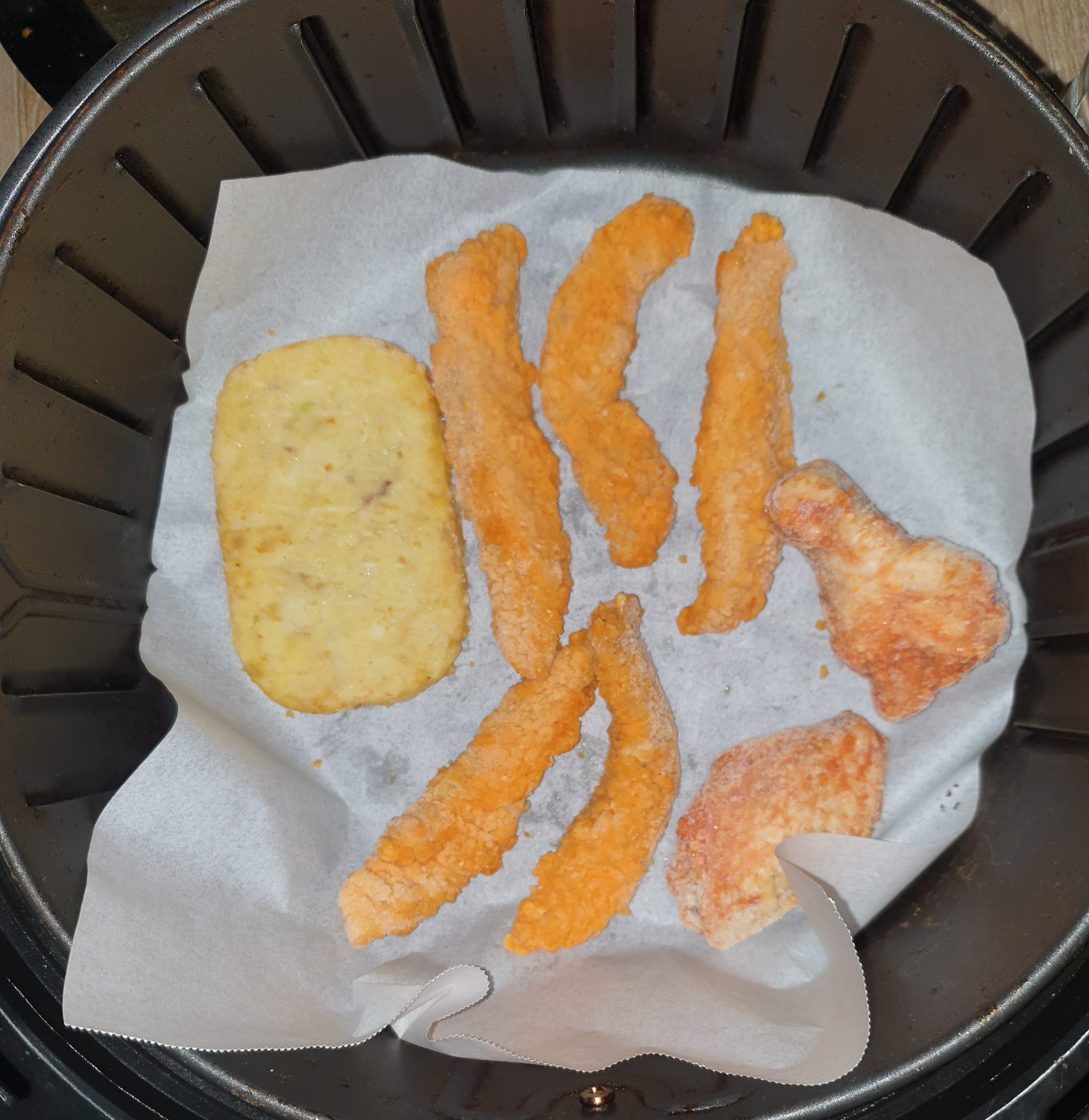 에어프라이어를 활용해 치킨 윙, 봉, 텐더, 해쉬브라운을 조리한 사진입니다.