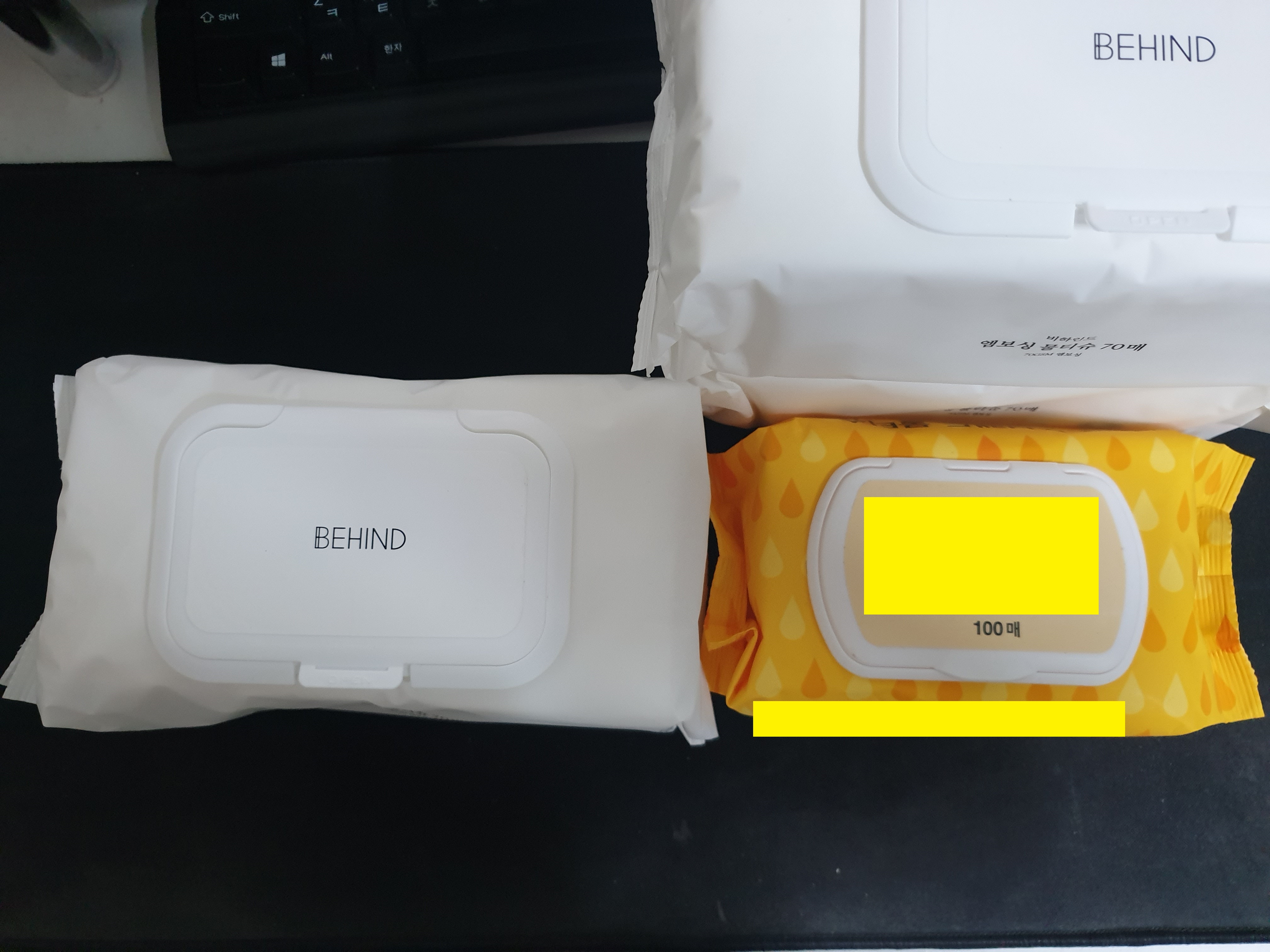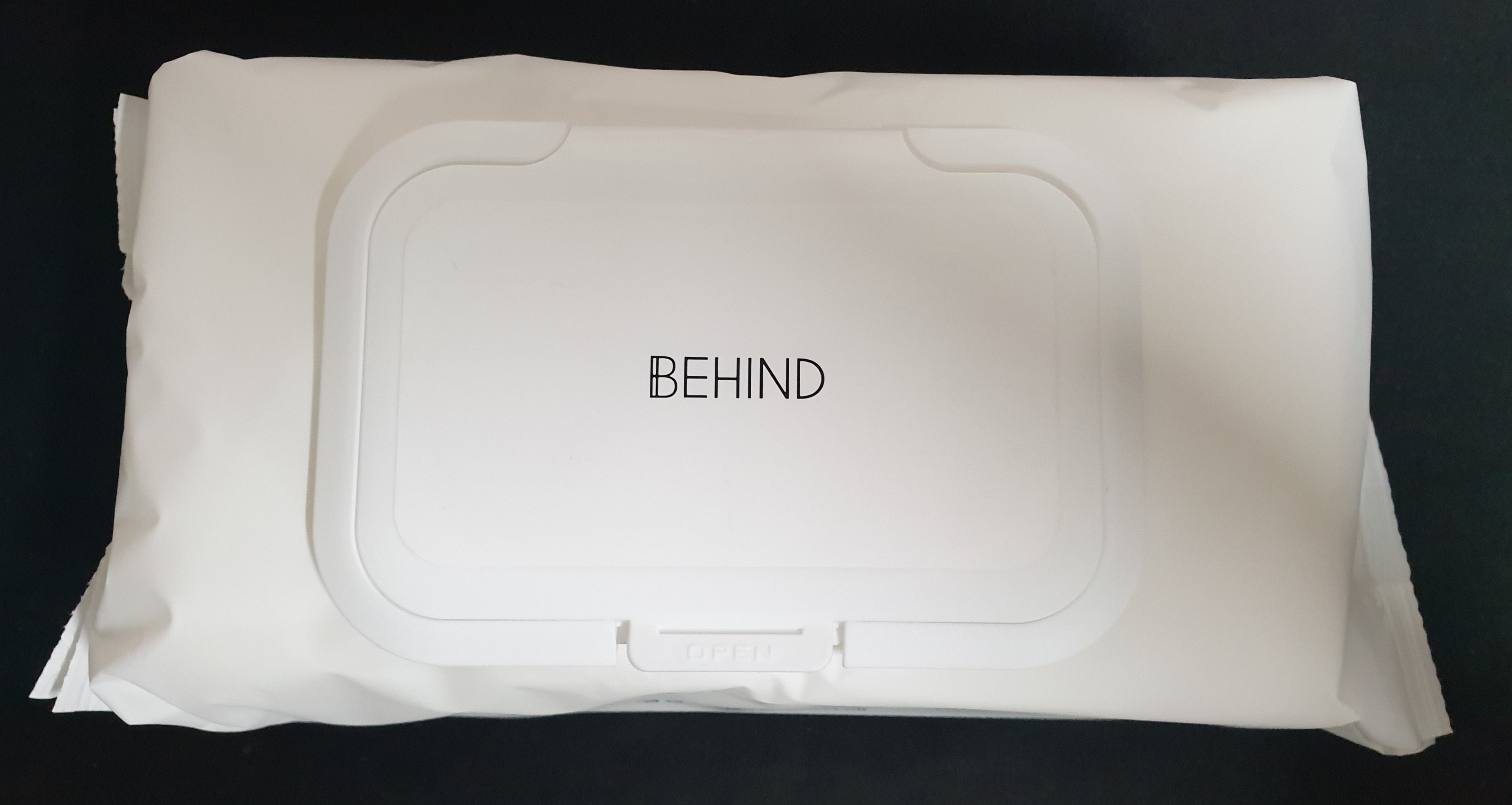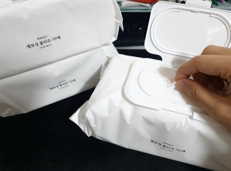 단순히 책상 위에 올려놓기만 해도 뒤에 비치는 검은 장패드의 빛깔이 다르다. 비하인드 프리미엄 엠보싱 물티슈의 두툼함은 마치 식당의 물수건과도 같은 안정감을 준다. 한 번 쓰고 버리기에는 아까울 정도의 튼튼함이다.