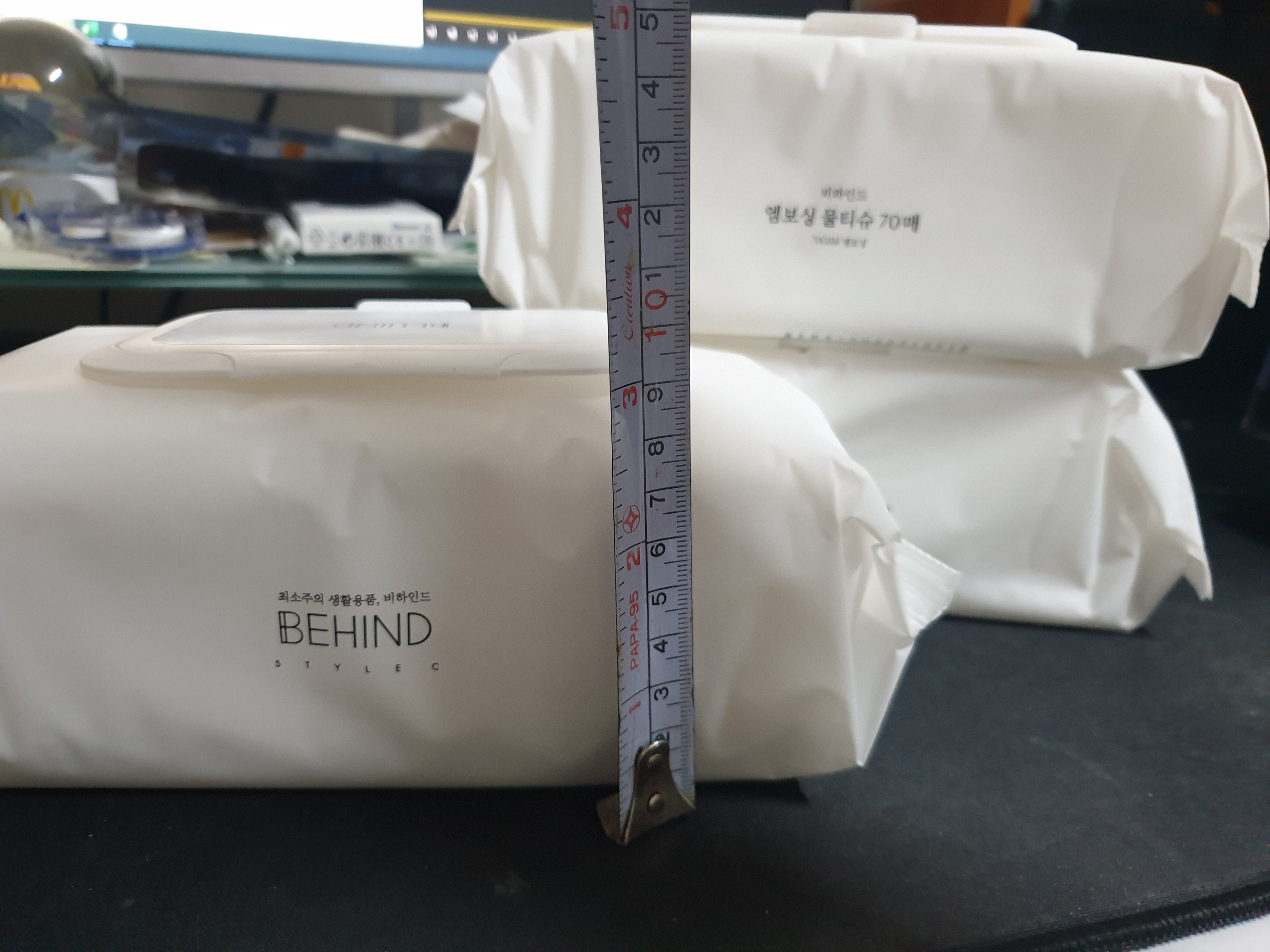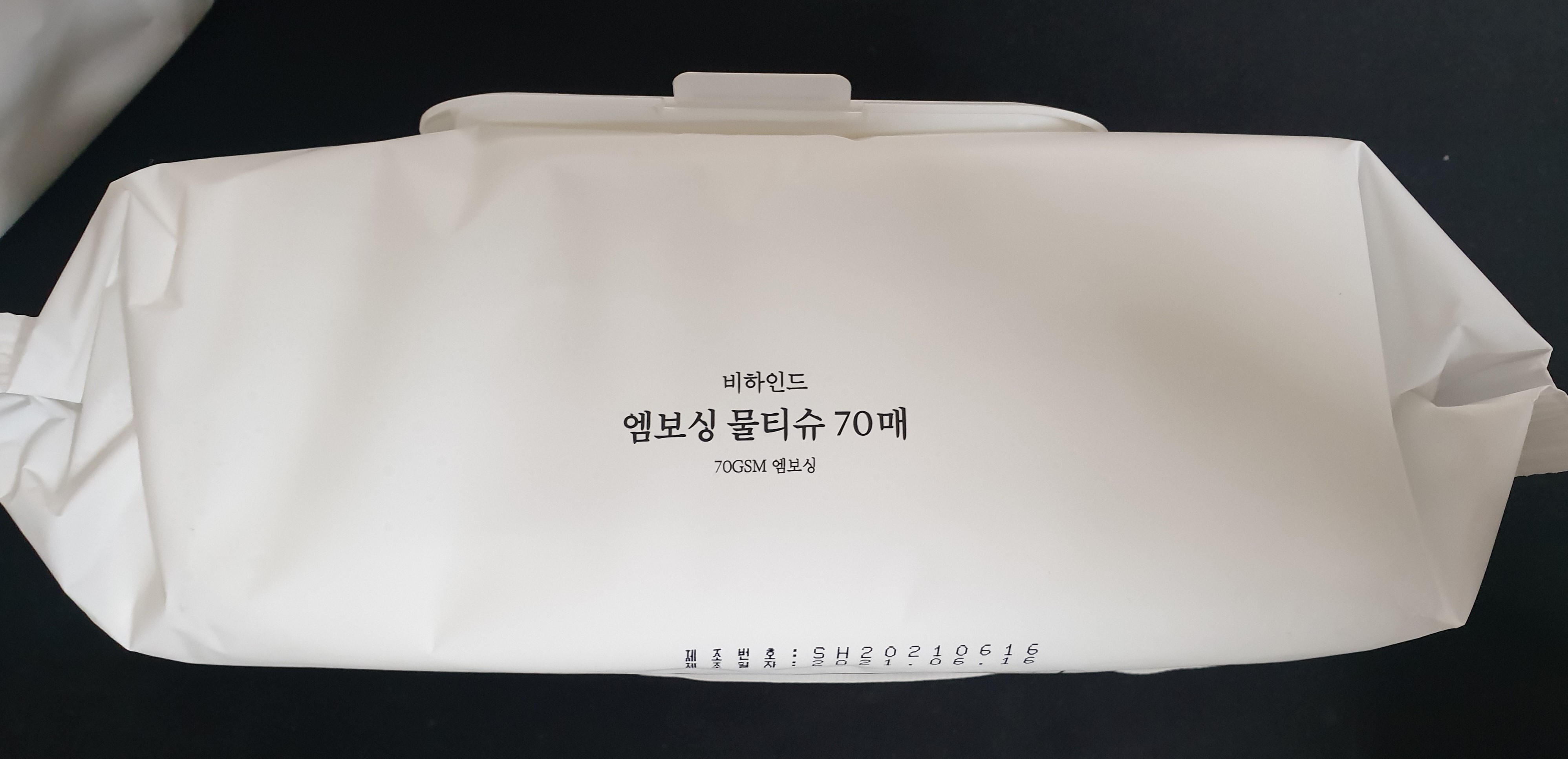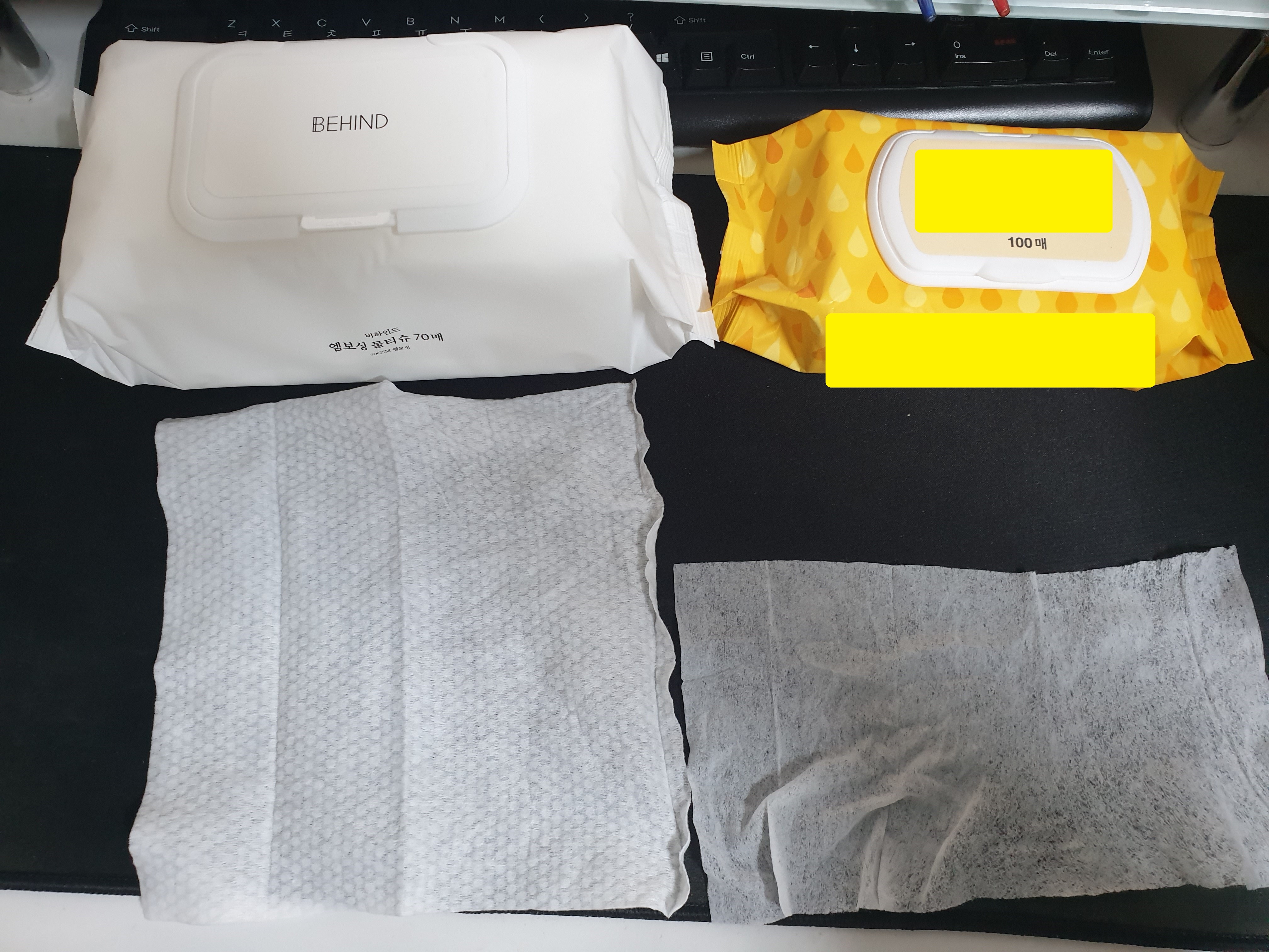단순히 책상 위에 올려놓기만 해도 뒤에 비치는 검은 장패드의 빛깔이 다르다. 비하인드 프리미엄 엠보싱 물티슈의 두툼함은 마치 식당의 물수건과도 같은 안정감을 준다. 한 번 쓰고 버리기에는 아까울 정도의 튼튼함이다.