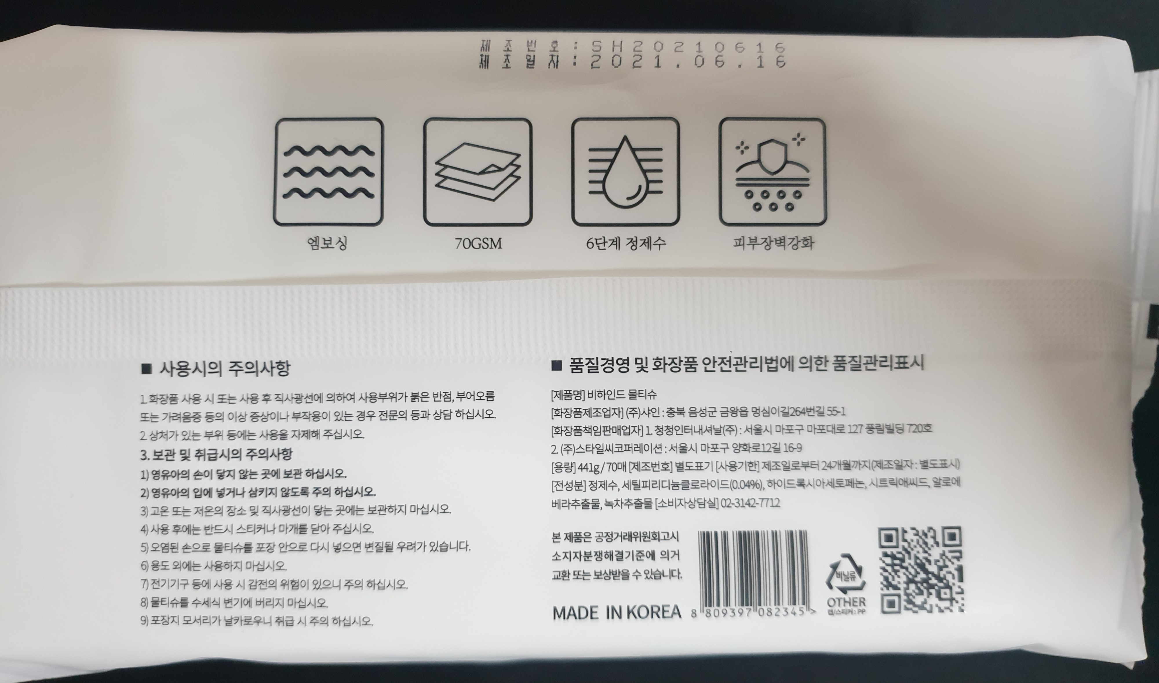 제품 후면에는 제품의 특성인 엠보싱과 70GSM, 6단계 정제수, 피부장벽강화의 그림이 그려져있다.