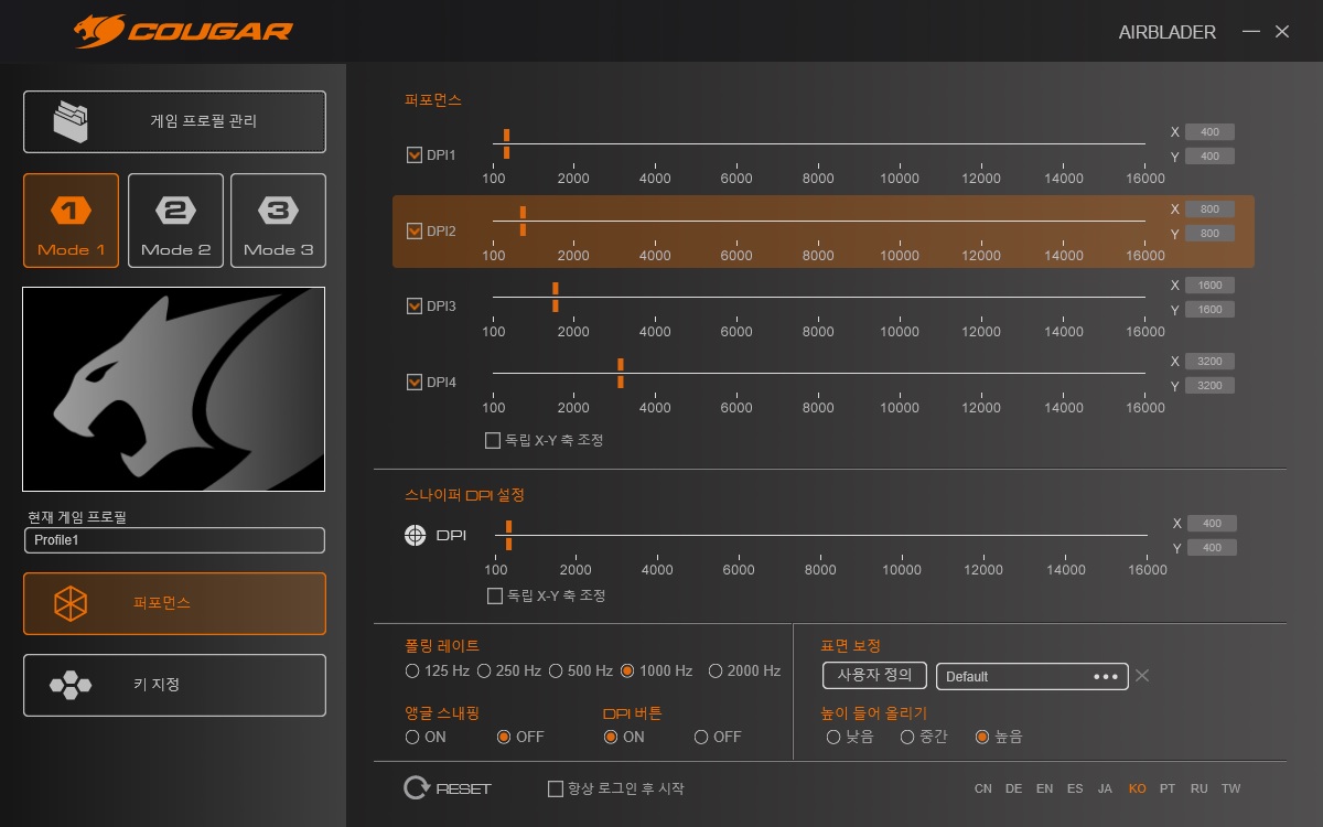 마우스의 DPI와 폴링레이트, 표면보정 및 LOD 설정을 조작할 수 있습니다.